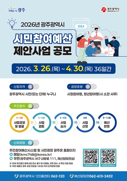 ±¤ÁÖ±¤¿ª½Ã´Â 2027³âµµ ¿¹»ê °úÁ¤¿¡ ½Ã¹ÎÂü¿©¸¦ º¸ÀåÇϱâ À§ÇÑ ¡®½Ã¹ÎÂü¿©¿¹»ê Á¦¾È»ç¾÷¡¯À» 4¿ù30ÀϱîÁö Á¢¼öÇÑ´Ù.