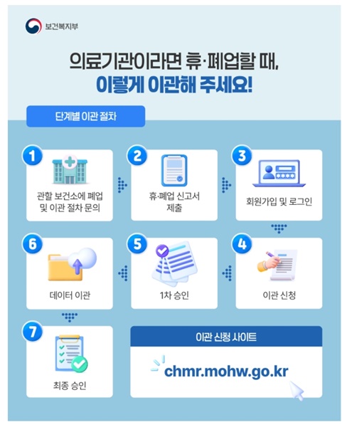 ÈÞ¡¤Æó¾÷ ÀÇ·á±â°üÀÇ Áø·á±â·ÏºÎ À̰ü ÀýÂ÷´Â ¡ã°üÇÒ º¸°Ç¼Ò¿¡ ÈÞÆó¾÷ ½Åû¼ Á¦Ãâ ¡ãÁø·á±â·Ï¹ß±ÞÆ÷ÅÐ(medichart.mohw.go.kr) À̰ü ½Åû ¡ã Áø·á±â·ÏºÎ À̰ü ¡ã º¸°Ç¼Ò ÃÖÁ¾ ½ÂÀÎ ¼øÀ¸·Î ÁøÇàµÈ´Ù.